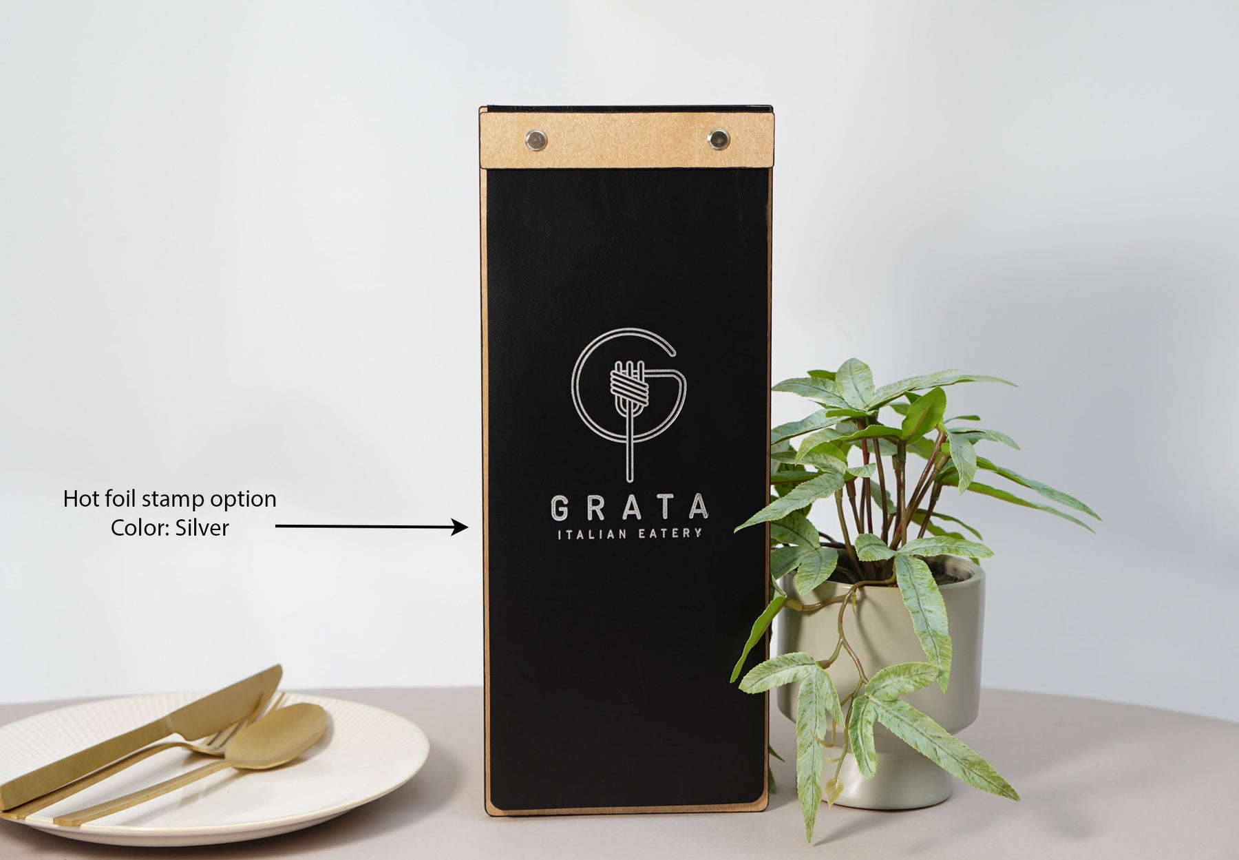 ✓ Your logo can be debossed (options: gold, silver, white or plain) (paid separately, the logo of another restaurant is given for an example)
