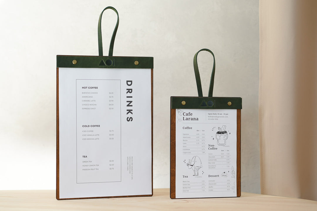 Leather & Wood Menu Cover: Embossed Logo Vintage Menu Board