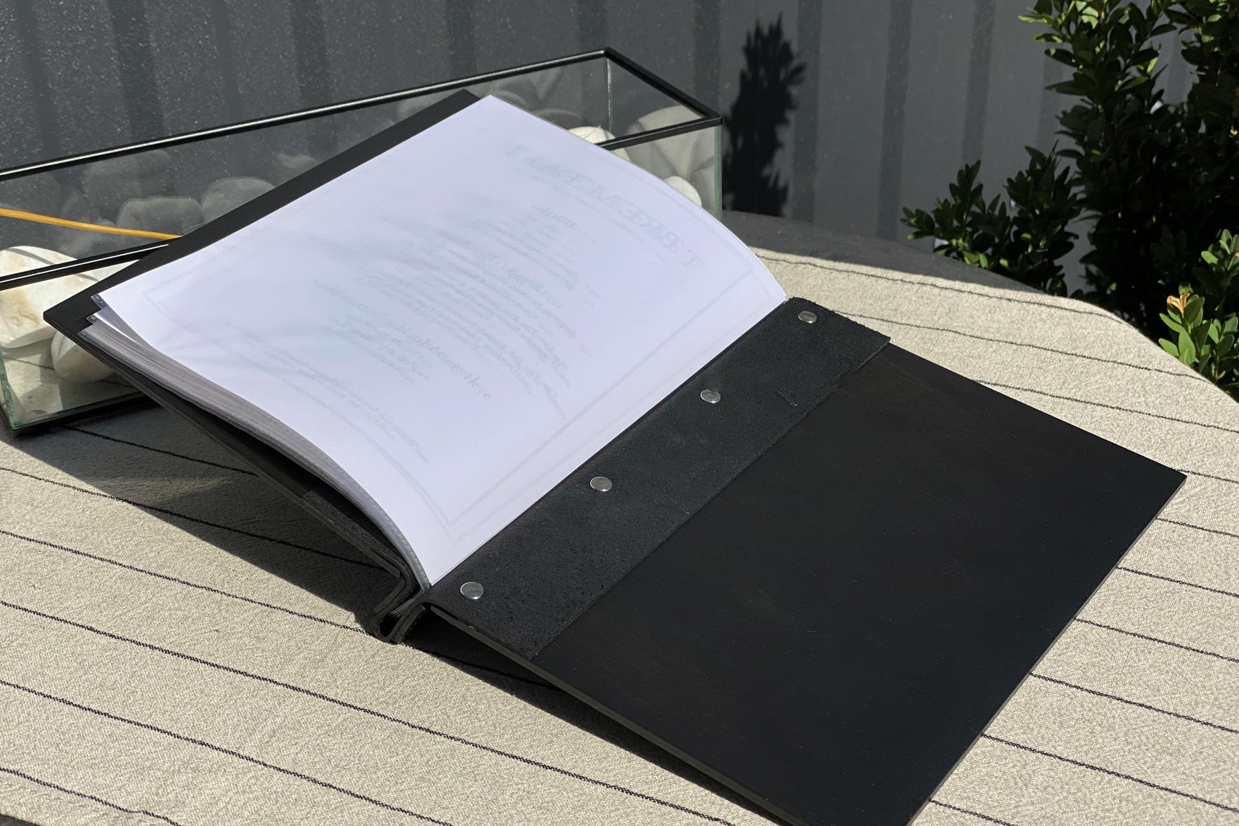 Handcrafted cover with screw post binding. Our screw menu cover features an external binding that not only looks great, but also allows you to hold as many, or as few pages as needed.